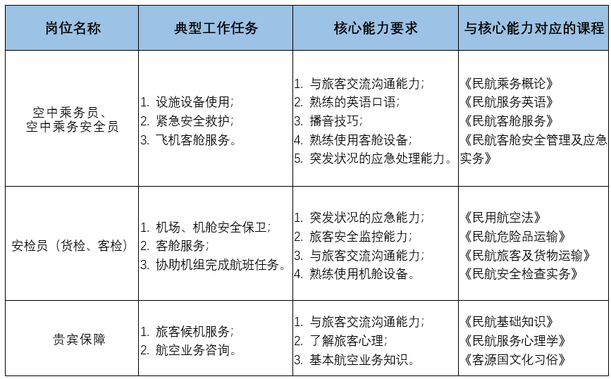 本专业主要面向各航空公司、机场等民航企事业,培养既有良好的职业素养,又掌握航空服务专业理论知识和基本技能,德智体全面发展的高素质技术技能型航空服务人才。学生毕业后主要在航空公司、机场等民航企事业从事空中服务、机场地面服务、民航安检、民航运输、客票销售等工作。